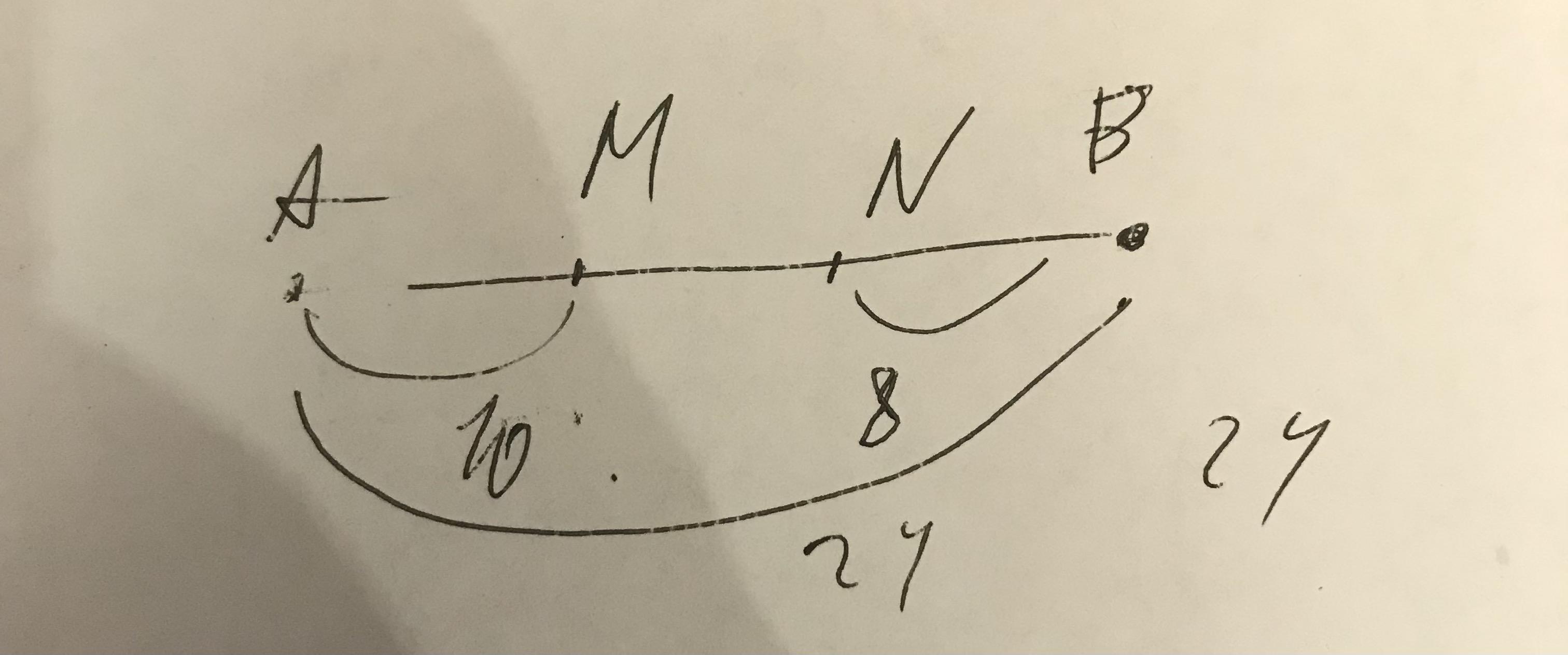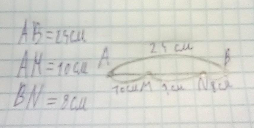 На отрезке AB взяты точки M и N известно что AB=24см, AM=10 см, BN=8см найдите длину MN пожалуйста даю 50 балов
