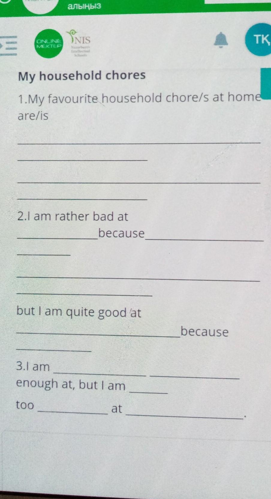 2.dish washing,bc its boring and difficult,but im quite good at ironing bc i find it exiting and easy