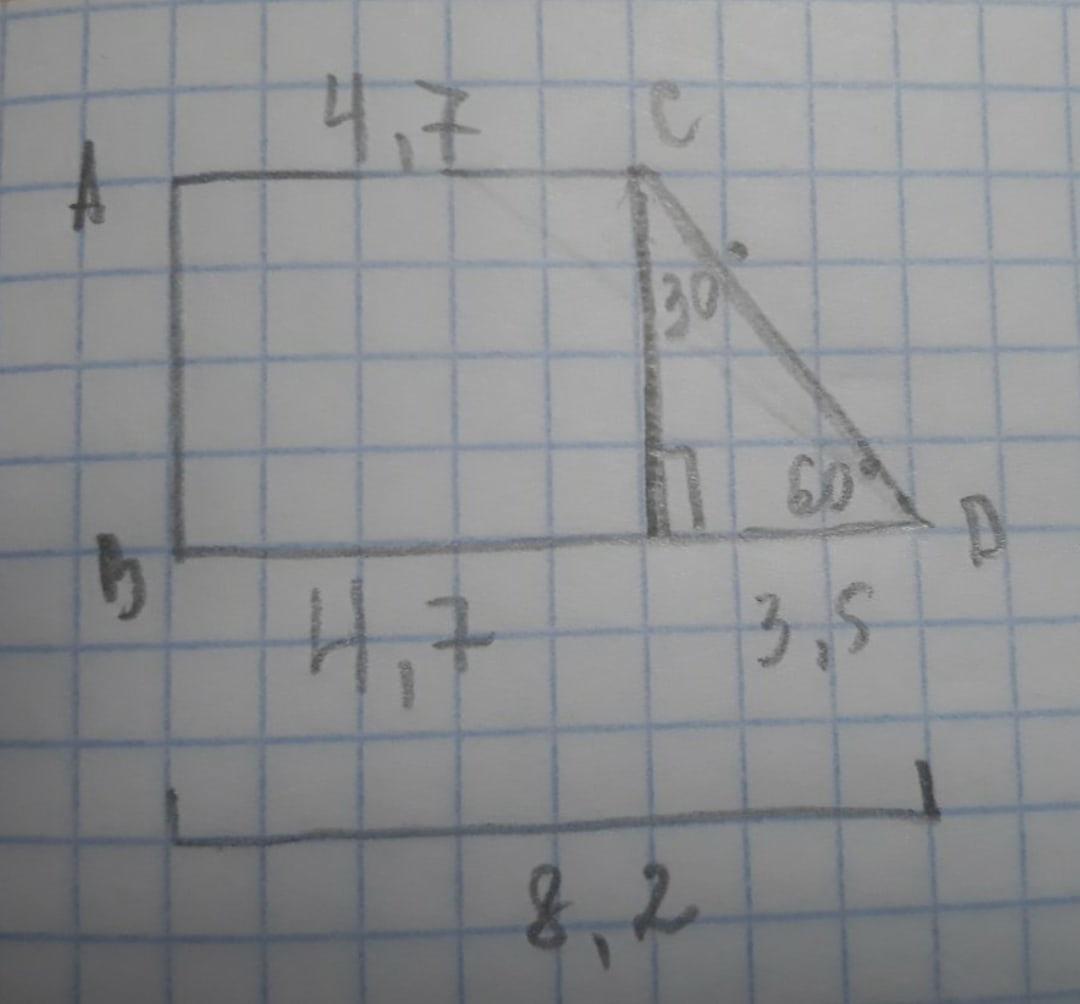 Определи длину большей боковой стороны прямоугольной трапеции, если один из углов трапеции равен 60°, меньшее основание — 4,7 см, большее основание — 8,2