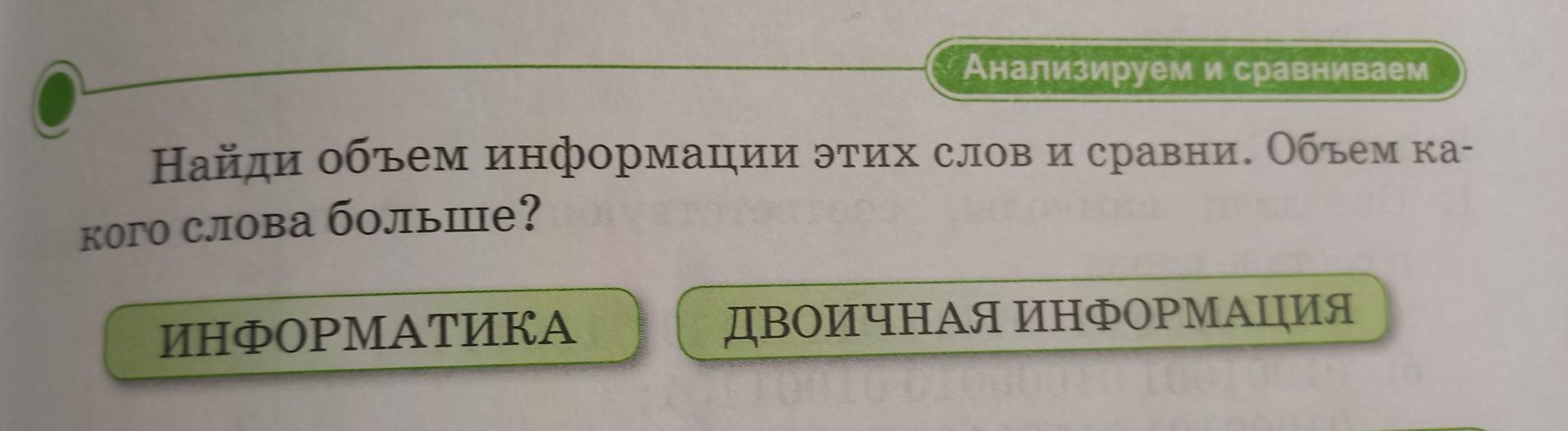 Анализируем и сравниваем Найди объем информации этих слов и сравни. Объем ка- кого слова больше? "ИНФОРМАТИКА" "ДВОИЧНАЯ ИНФОРМАЦИЯ"