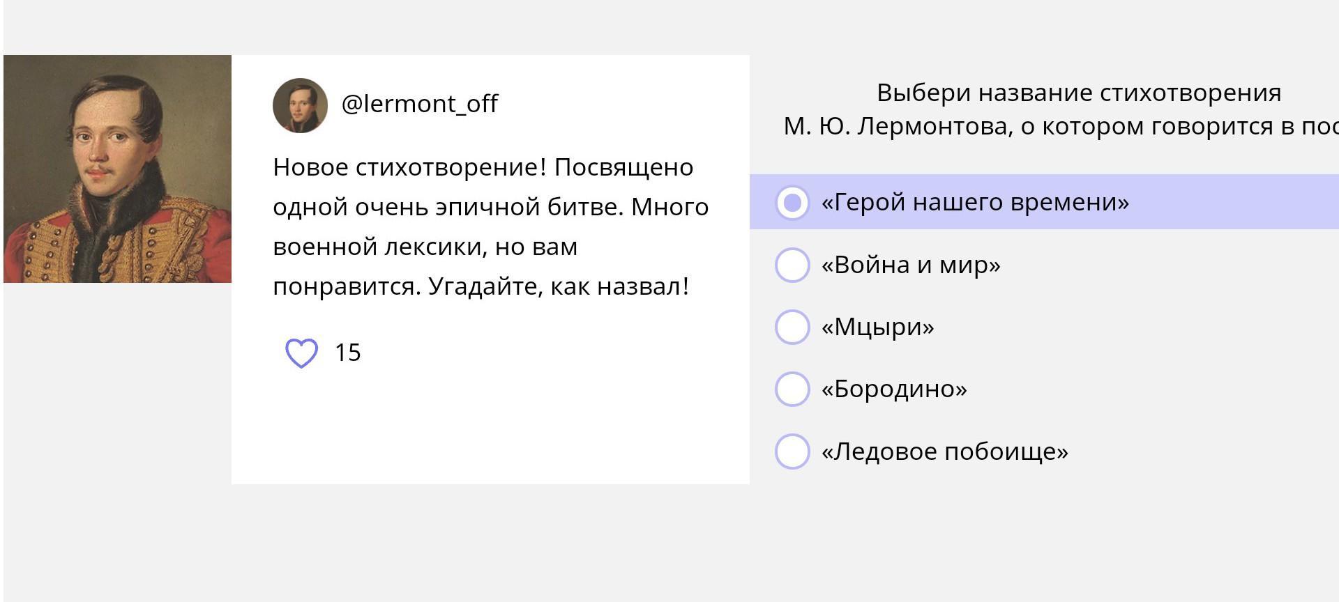 Лермонтов: написал новое стихотворение! посвященио одной очень эпичной битве. много военной лексики, но вам понравится. угадайте как назвал! А)"Герой нашего времени" Б)"Война и мир" В)"Мцыри" Г)"Бородино" Д)"Ледовое побоище"