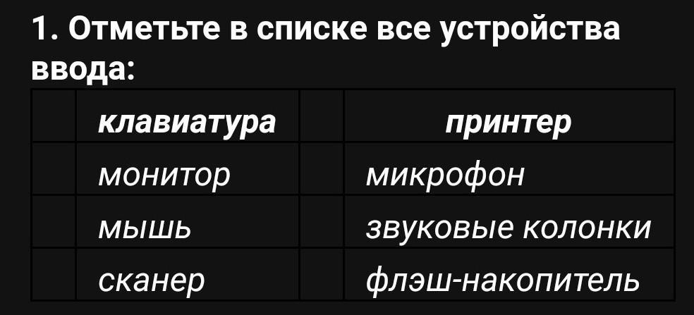 Остальные являются устройствами вывода, кроме флэш-накопителя. Он являются устройством хранения.
