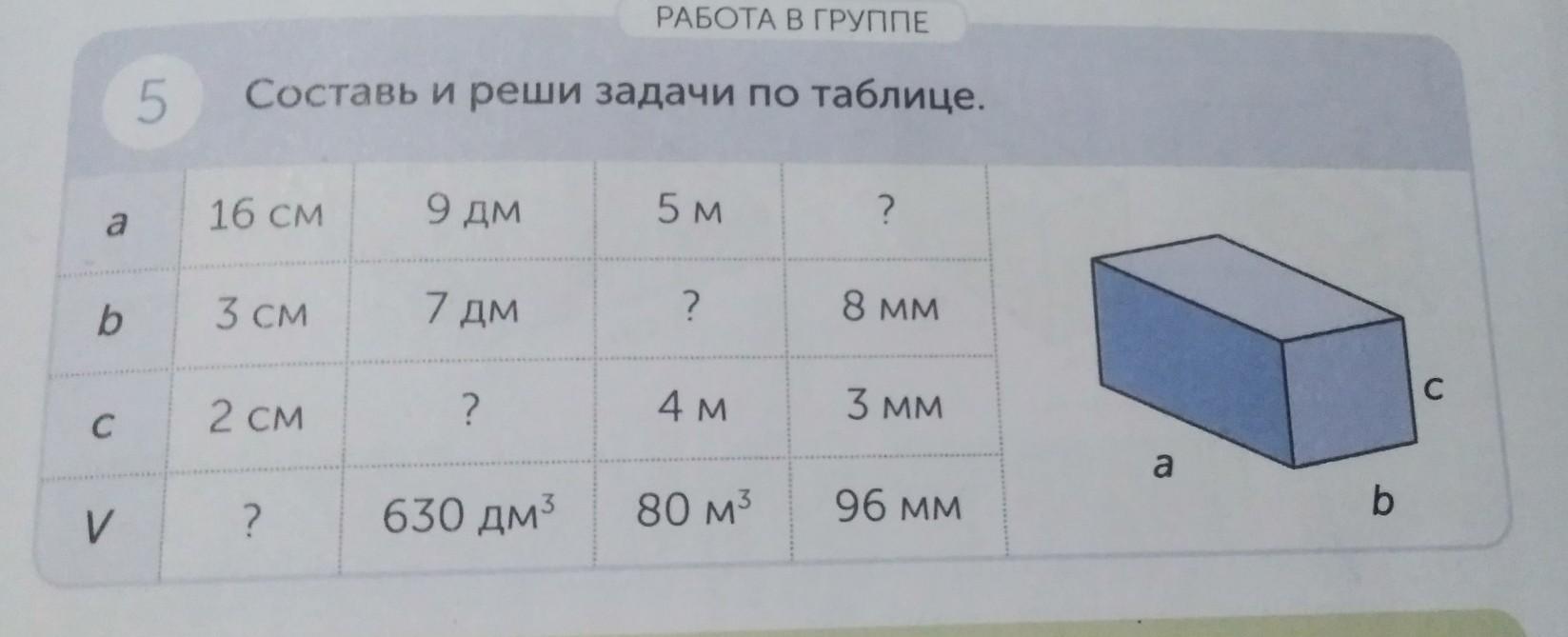 5 Составь и реши задачи по таблице. 16 см 9 дм 5 м ? a b 3 см 7 дм ? 8 MM с 2 см с 4 м ? 3 мм а V ? 630 дм3 80 м3 96 мм пожалуйста можно прям решение написать