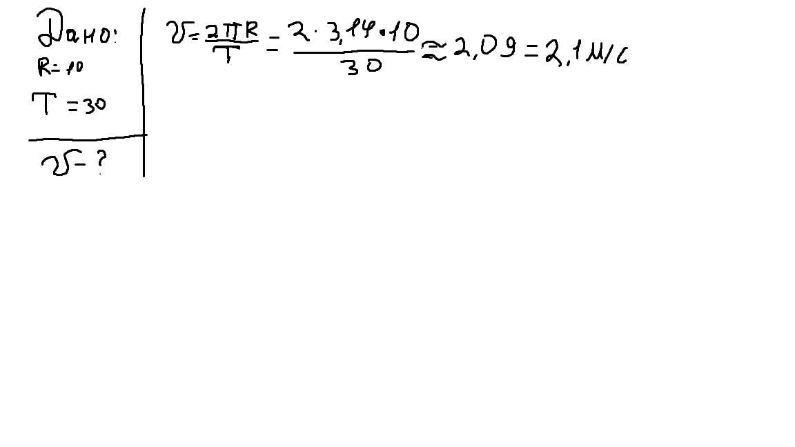 Тело движется по окружности радиусом 10. Период его обращения равен 30с. Чему равна скорость тела