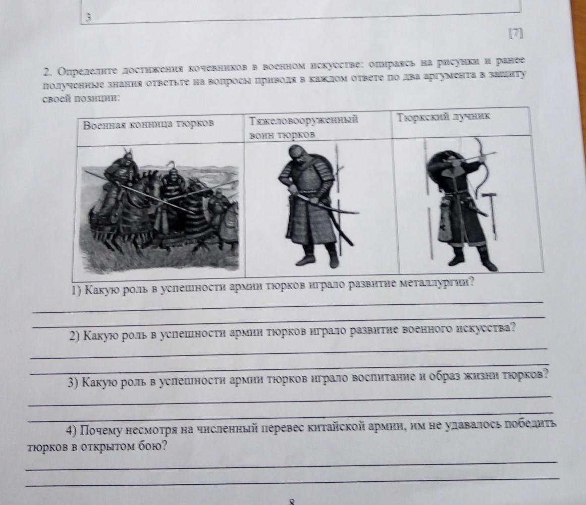 2. Определите достижения кочевников в военном искусстве: опираясь на рисунки и ранее полученные знания ответьте на вопросы приводя в каждом ответе по два аргумента в защиту своей позицин: Воснная конница тюрков Тяжеловооруженный воин тюрков Тюркский лучник 1) Какую роль в успешности армии пюрков играло развитие металлургии? 2) Какую роль в успешности армии тюрков играло развитие военного искусства? 3) К 3) Какую роль в успешности армии тюрков играло воспитание и образ жизни тюрков? 4) Почему несмотря на численный перевес китайской армии, им не удавалось победить тюрков в открытом бою?