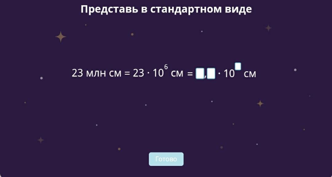 например, число 2000 можно записать как 2⋅1000, или 2⋅103. Степень 10 (в данном случае «3») показывает, сколько нулей нужно приписать справа за первым множителем (в нашем примере — «2»).