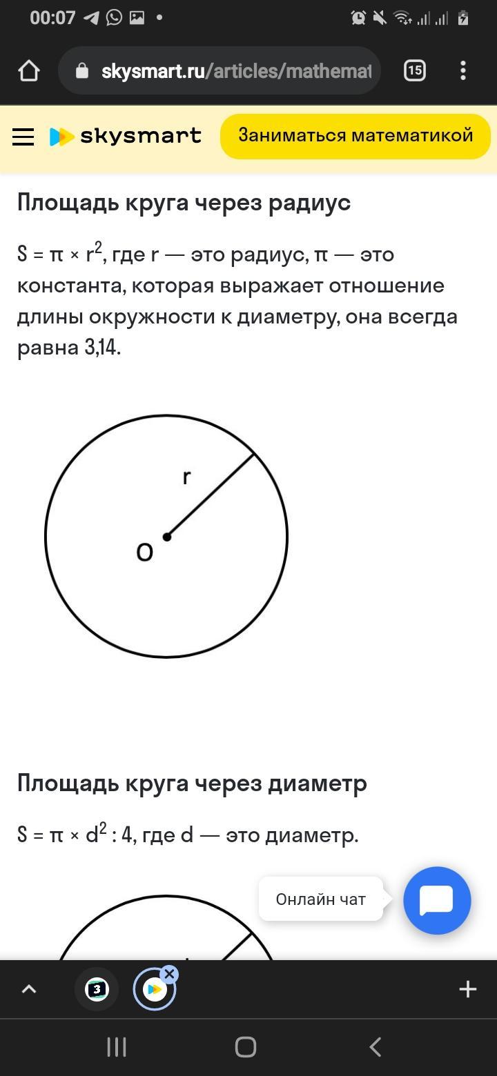 S = π × r2, где r — это радиус, π — это константа, которая выражает отношение длины окружности к диаметру, она всегда равна 3,14.