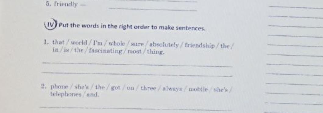 1. I`m sure that in the whole world friendship absolutely is the most fascinating thing. 2. She`s got three telephones and she`s always on mobile phone. 3.We like to the cinema but sometimes can`t agree what the film going to see. 4. Life outdoor never gets bored and they enjoys. 5. Always avoid talking about your dear and near friends behind the back.