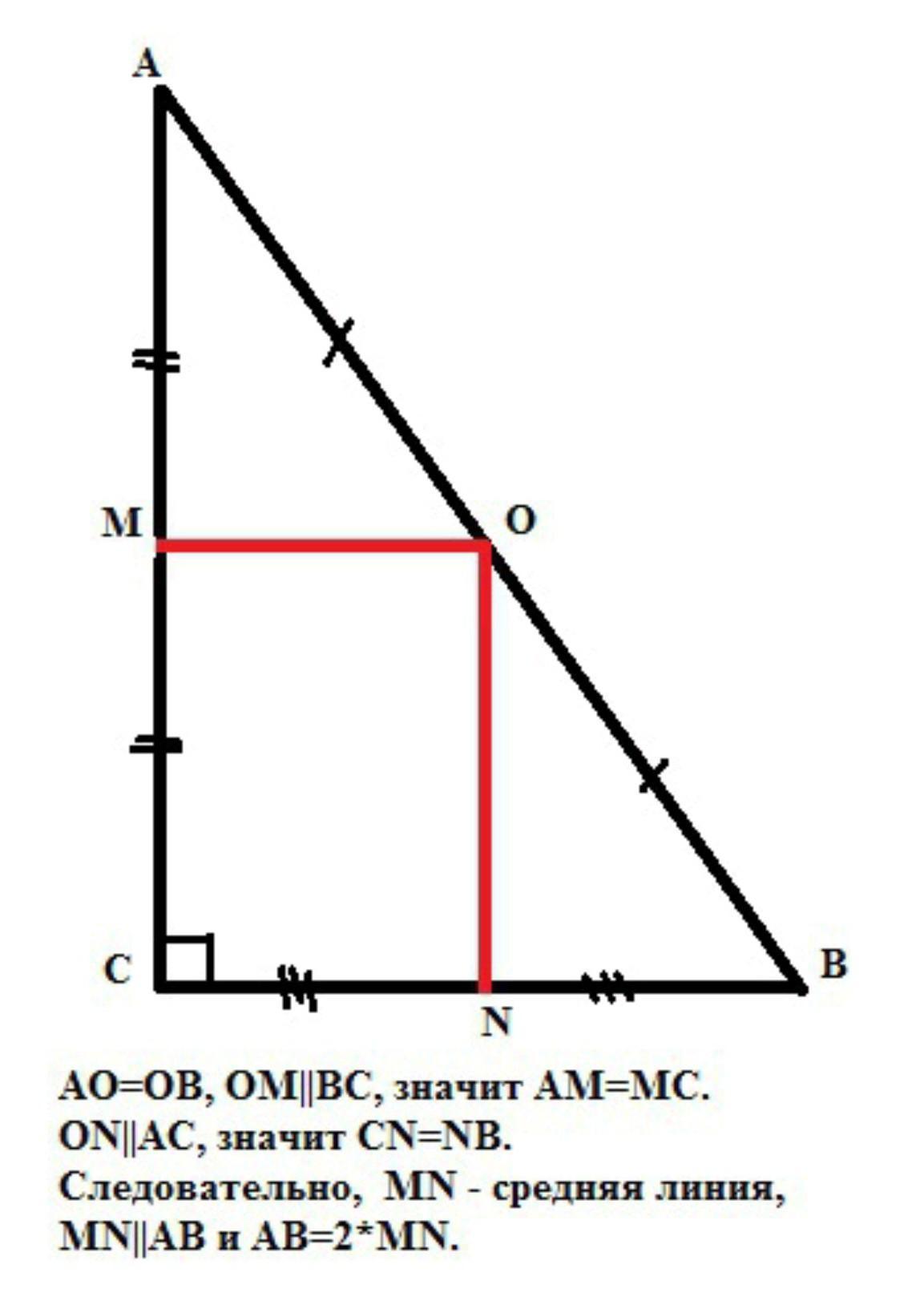 Через середину O гипотенузы AB прямоугольного треугольника ABC проведены прямые, параллельные его катетам. Одна из них пересекает катет AC в точке M, а другая — катет BC в точке N. Найдите гипотенузу AB, если MN = 7 см