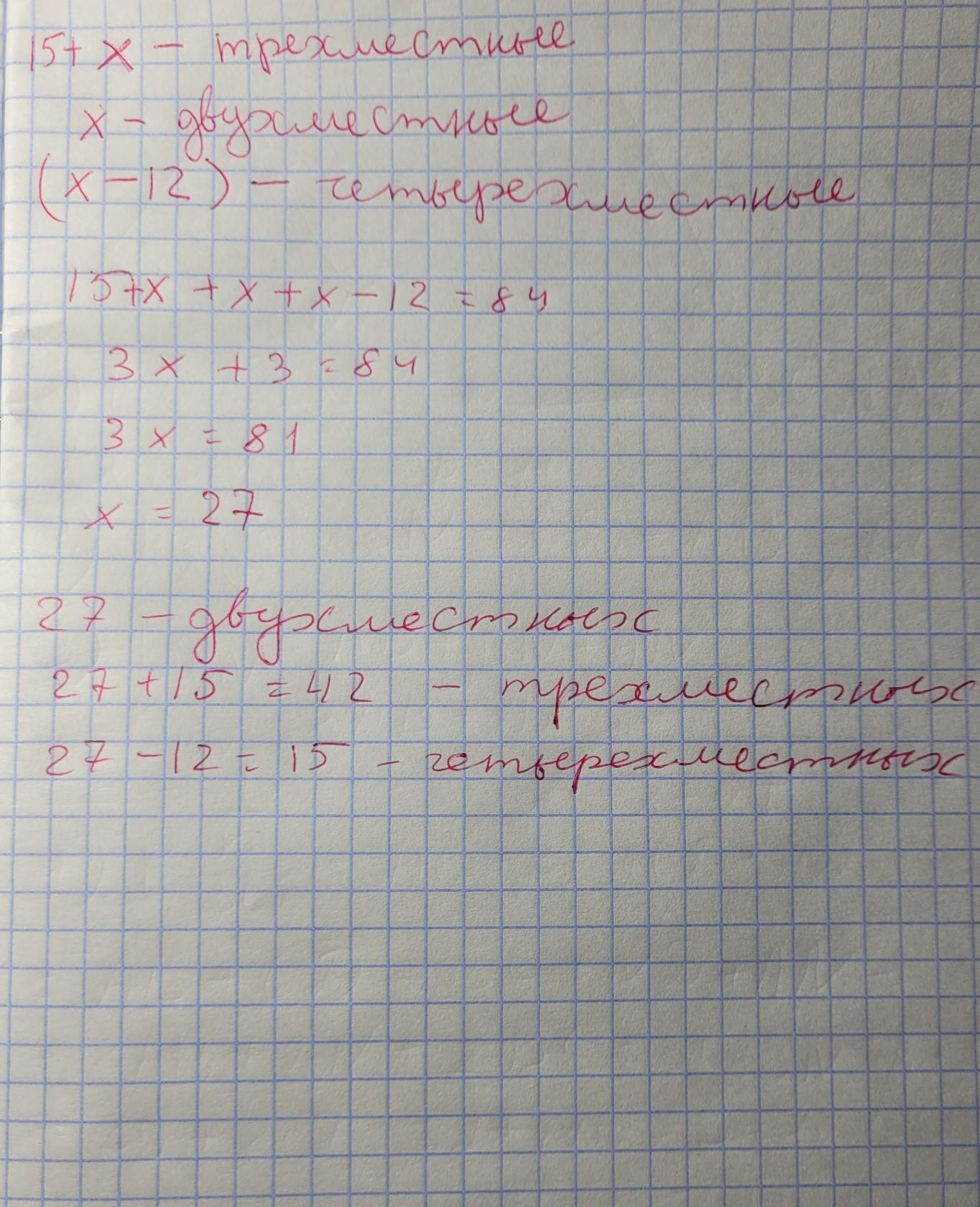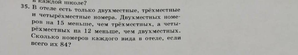 Пусть х - двухместные номера, тогда (х + 15) - трёхместные номера и (х - 12) - четырёхместные номера. Всего 84 номера. Уравнение: