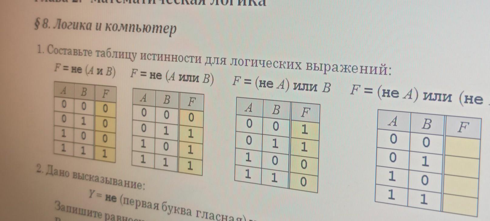 1. Первая таблица - неправильно. Там стоит частичка "не". Нужно наоборот (1,1,1,0)