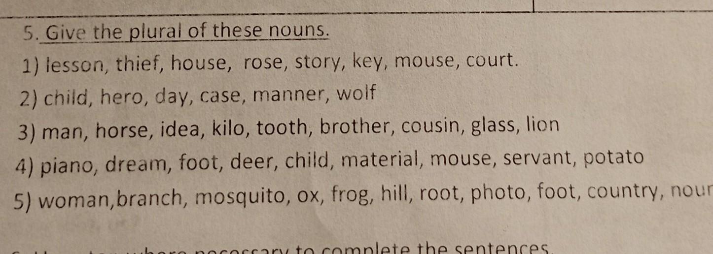 5. Give the plural of these nouns. 1) lesson, thief, house, rose, story, key, mouse, court. 2) child, hero, day, case, manner, wolf 3) man, horse, idea, kilo, tooth, brother, cousin, glass, lion 4) piano, dream, foot, deer, child, material, mouse, servant, potato 5) woman, branch, mosquito, ox, frog, hill, root, photo, foot, country, noun
