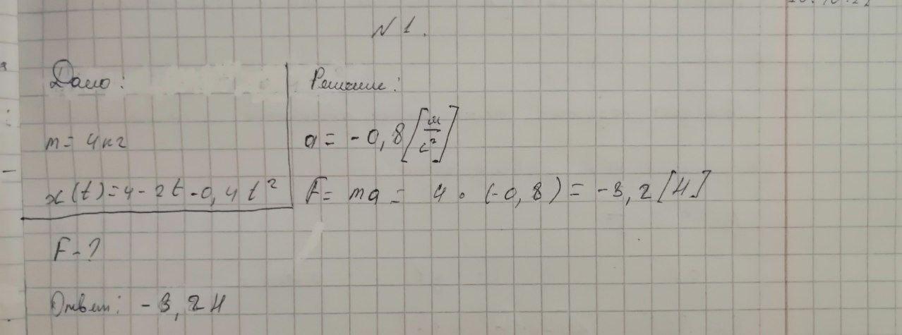 1.Определите силу, которая действует на тело массой 4 кг, движущегося прямолинейно равноускоренно, если его координата изменяется согласно уравнению: x(t)=4-2t-0,4t^2.