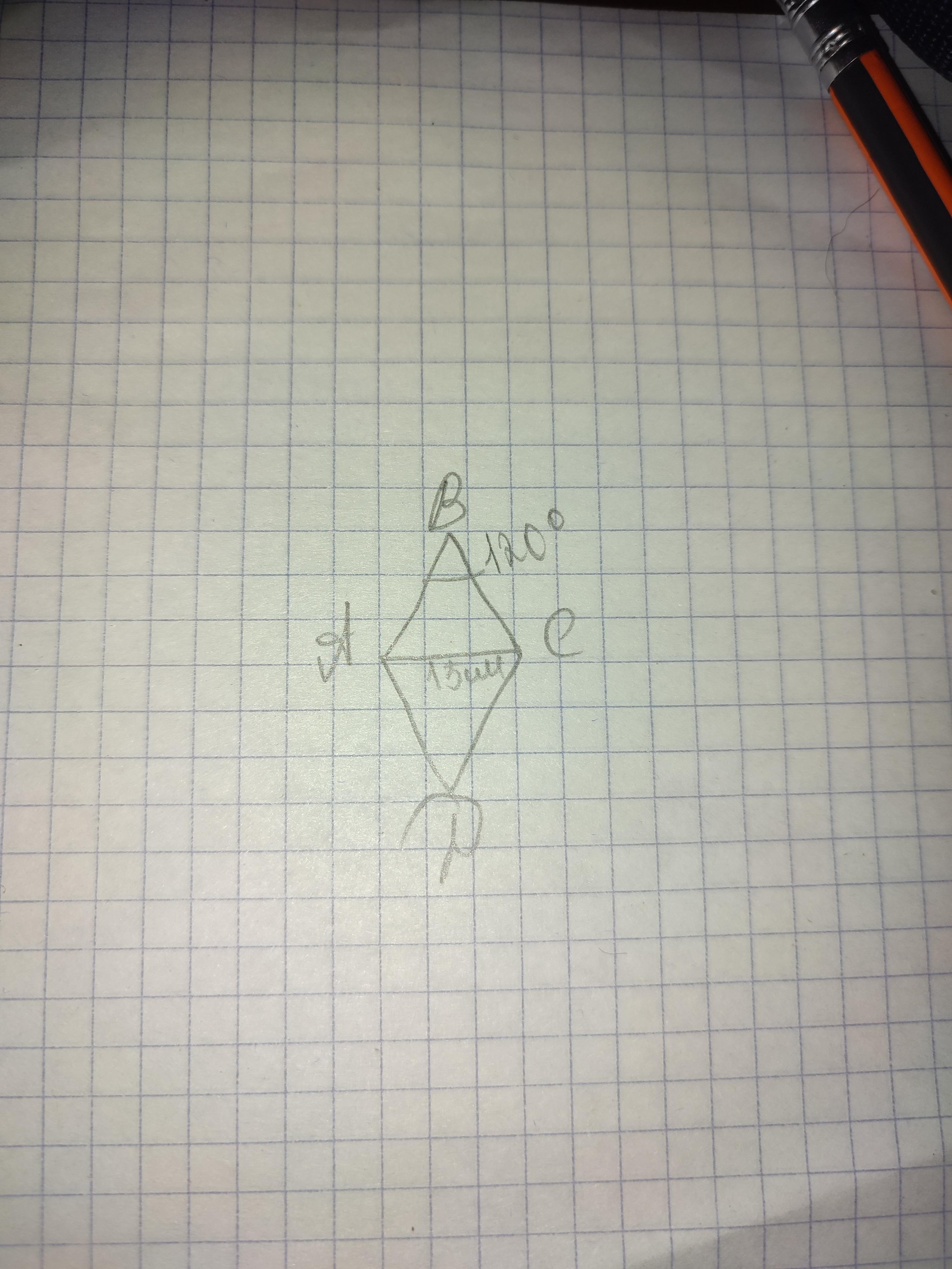 Один из углов ромба равен 120 градусов, а диагональ, исходящая из него, равна 15 см. Найдите периметр ромба.