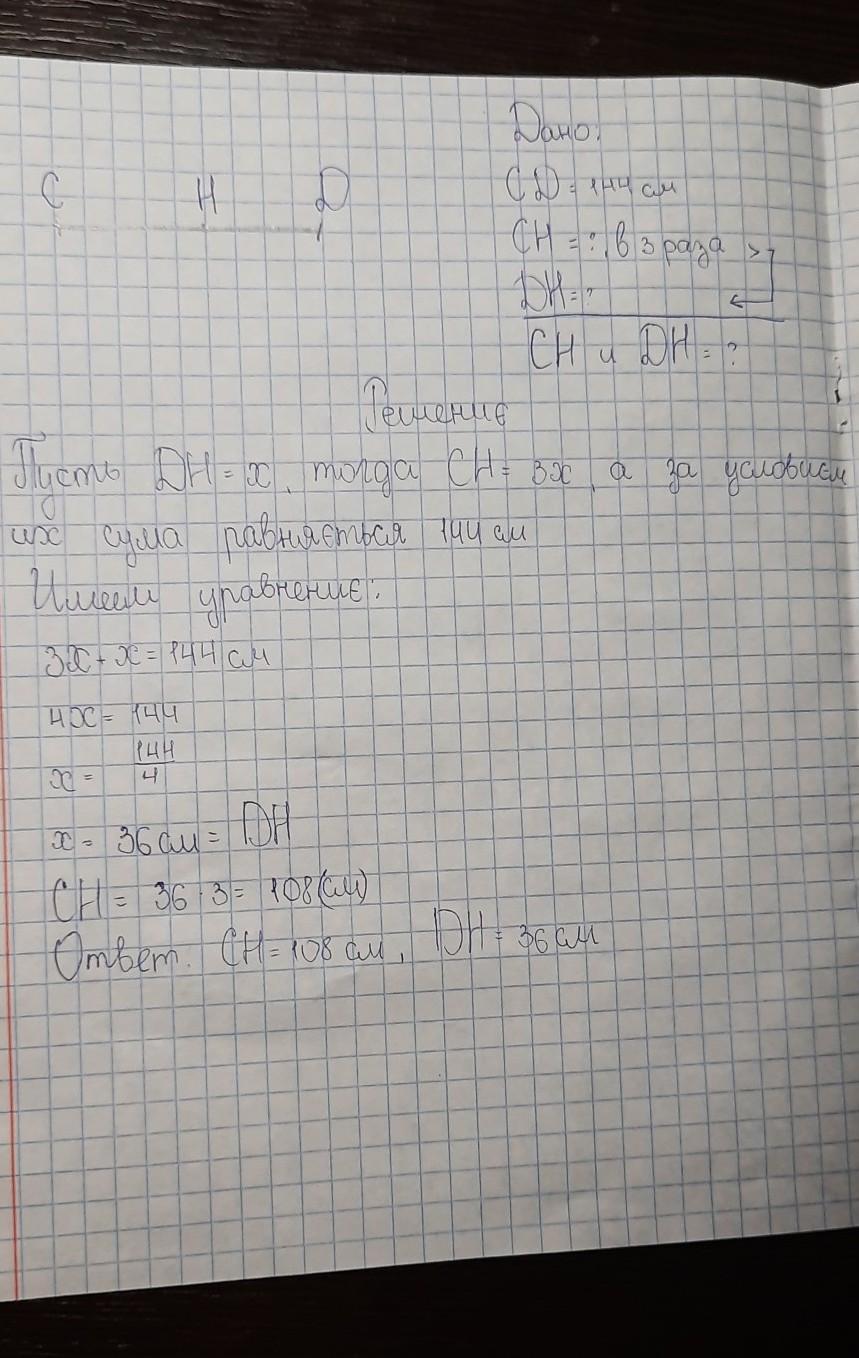 На отрезке CD длиной 144 см отмечена точка H. Известно, что отрезок CH в три раза длиннее отрезка DH. Найдите длины отрезков CH и DH