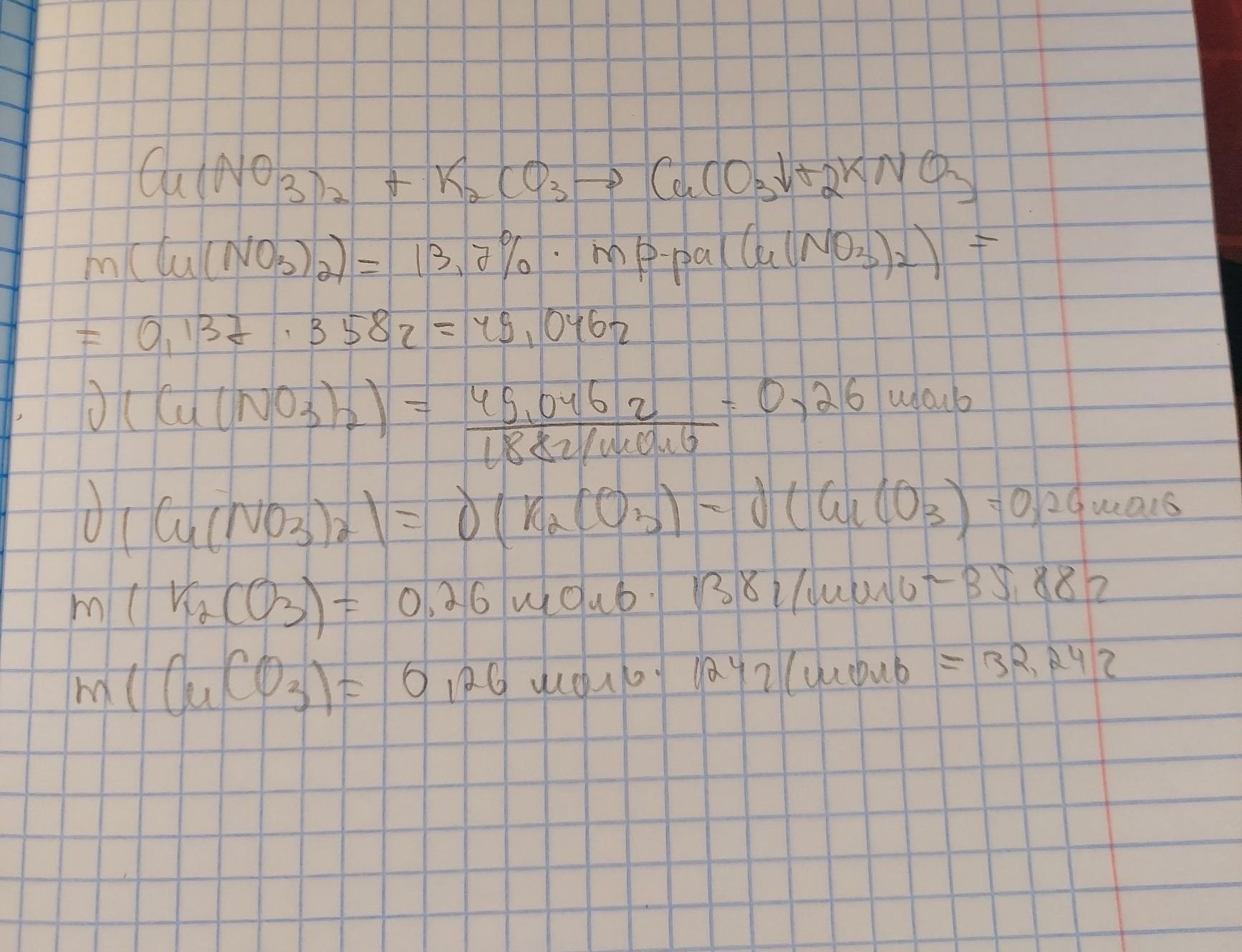 Нитрат меди2 массой 358г и массовой долей 13,7% добавили карбонат калия. Определите массы осадка и карбоната K