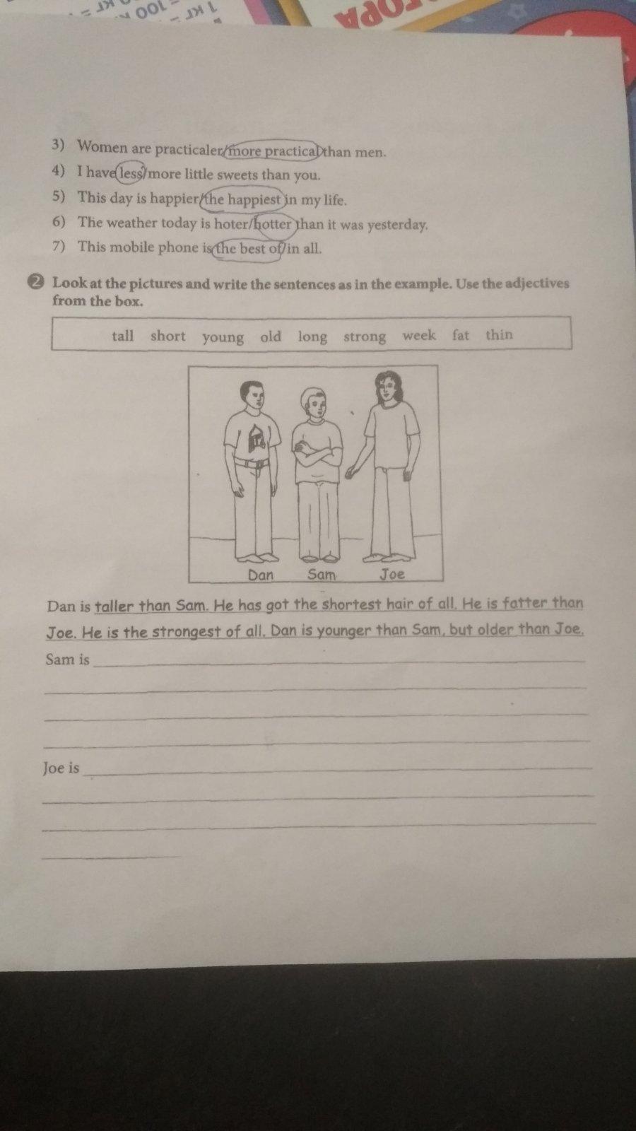 Sam is the shortest of all. His hair is longer than Dan's and shorter than Joe's. He is fatter that Joe, but thinner than Dan. He is the youngest of all.