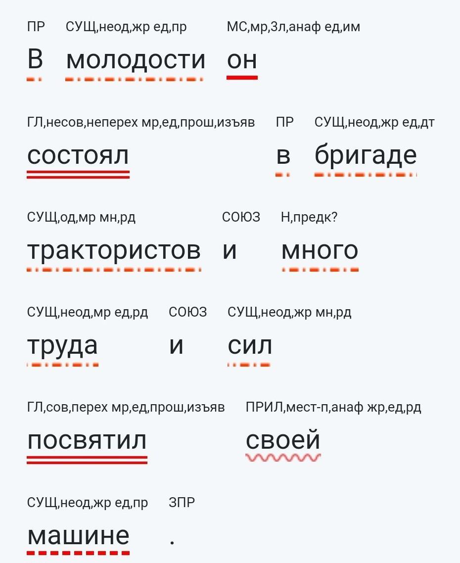 синтаксический разбор предложения в молодости он состоял в бригаде трактористов и много труда и сил посвятил своей машине