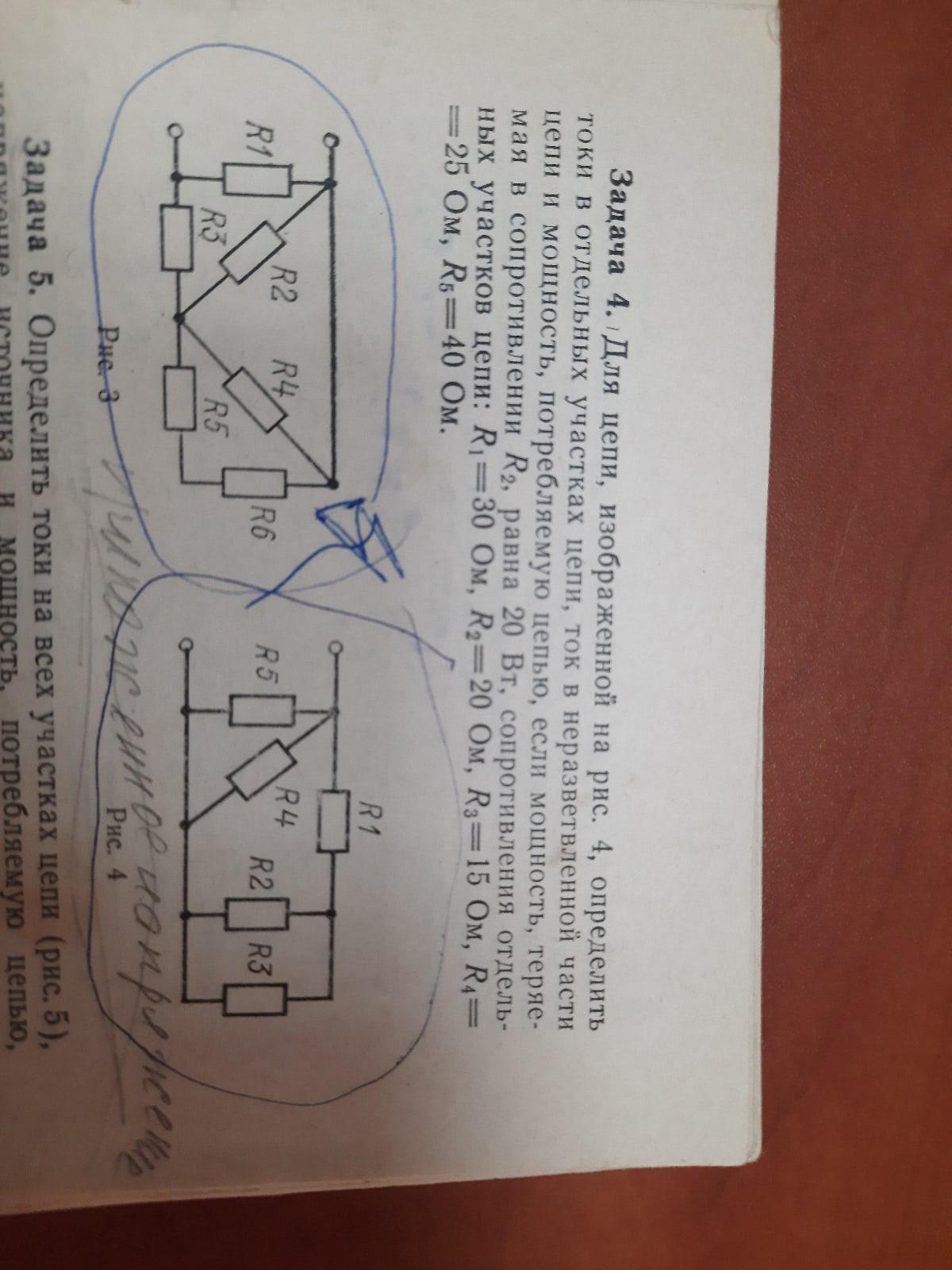 Задача 4. Для цепи, изображенной на рис. 4, определить токи в отдельных участках цепи, ток в неразветвленной части цепи и мощность, потребляемую цепью, если мощность, теряе- мая в сопротивлении R2, равна 20 Вт, сопротивления отдельных участков цепи: R==30 Ом, R3==20 Ом, R3==15 Ом, R4== =25 Ом, R5=40 Ом.