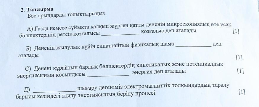 2. Тапсырма Бос орындарды толыктырыны А ) Газда немесе сұйыкта калкып жүрген катты дененiн микроскопиялык те сак болшектерiнiн ретсіз козгалысы козгалы деп аталады [ 1 ] Б ) Дененін жылулык куйiн сипаттайтын физикалык шама аталады C ) Денені құрайтын барлык белшектердiн кинетикалык және потенциалдық энергиясынын косындысы энергия деп аталады Д ) шыгару дегеніміз электромагниттік толқындардын таралу барысы кезіндегі жылу энергиясынын берілу процесі nen