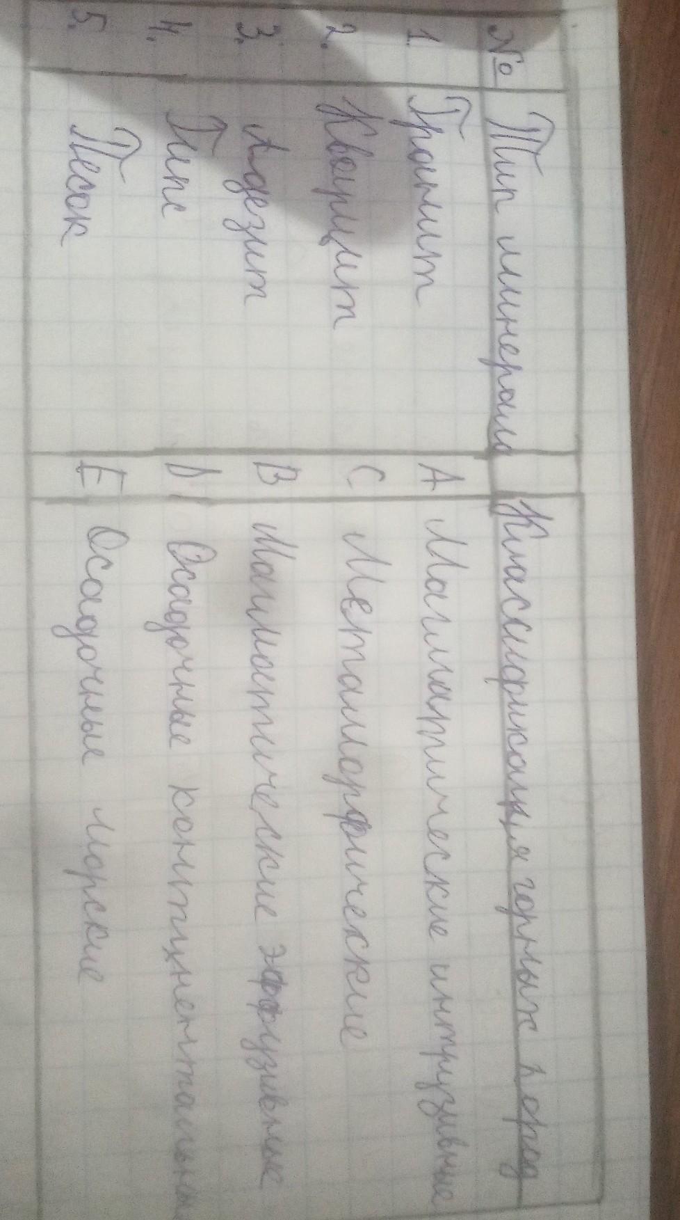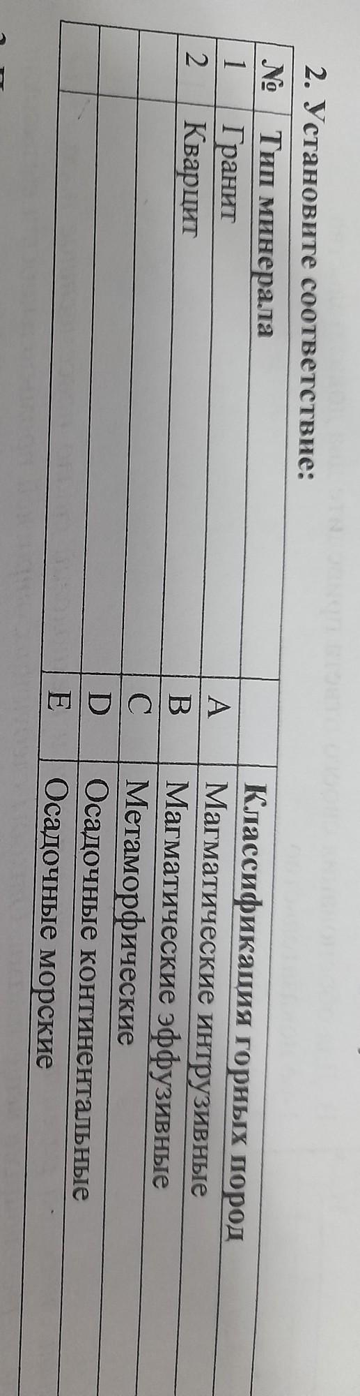 2. Установите соответствие: No Тип минерала 1 Гранит 2 Кварцит A B С D E Классификация горных пород Магматические интрузивные Магматические эффузивные Метаморфические Осадочные континентальные Осадочные морские