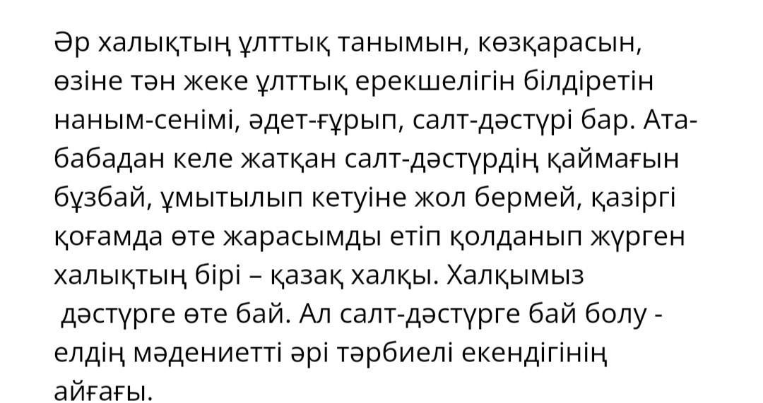 Салт-дәстүр деген не, соған тоқталып өтейін. Салт-дәстүр – ел өмірімен біте қайнасып кеткен рухани және мәдени азық. Біздің халқымыз өз ұрпақтарын қасиетті салт - дәстүрмен, өнегелі әдет-ғұрыппен, ырым-тыйыммен тәрбиелеп, ұлағатты ұл мен инабатты қызды теріс жолға түсірмей тәрбиелей білген. Бауыржан Момышұлы «мен өзімнің ұрыстағы тәжірибемнен жауынгерлік қасиетті тәрбилеуде ұлттық дәстүрдің маңызы зор екеніне көзім жетті» деп жазады. Бұдан отаншылдық, ерлік, мәрттік, жомарттық, адамгершілік қасиеттердің бәрі салт-дәстүр арқылы даритынын түсінуге болады. Яғни, салт-дәстүр адамды адастырмас тура жолмен жүруге, жөн-жосықты біліп, үйренуге және өмірде қолдануға үгіттейтін мызғымас заң іспетті десем де қателеспесім анық.