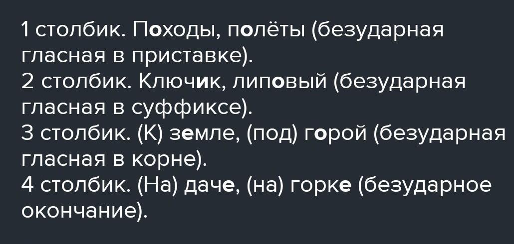 Запишите слова в четыре столбика в зависимости от того, в какой части слова находится орфограмма: Приставка Корень Суффикс Окончание : Походы, ключик, (на) даче, полёты, липовый, (к) земле, (на) горке, (под) горой