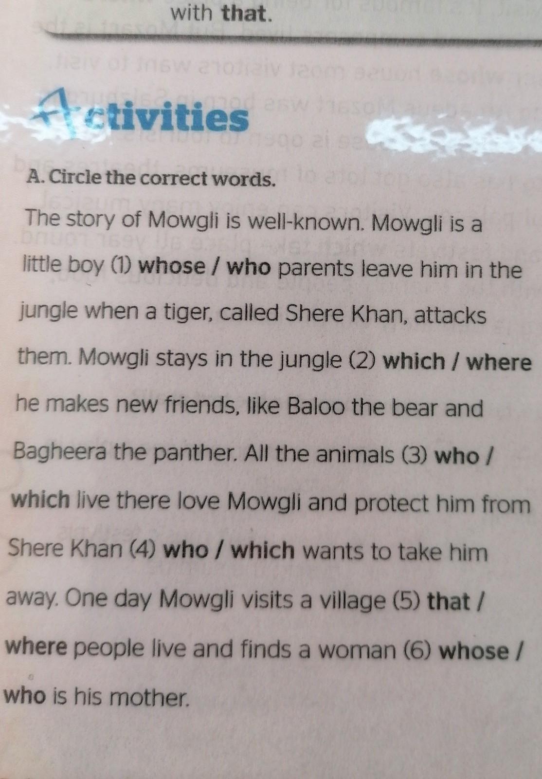 Activities A. Circle the correct words. The story of Mowgli is well-known. Mowgli is a little boy (1) whose / who parents leave him in the jungle when a tiger, called Shere Khan, attacks them. Mowgli stays in the jungle (2) which / where he makes new friends, like Baloo the bear and Bagheera the panther. All the animals (3) who / which live there love Mowgli and protect him from Shere Khan (4) who / which wants to take him W ba away. One day Mowgli visits a village (5) that/ where people live and finds a woman (6) whose / who is his mother. B Comnlete the sentences with who which that whore or whoro IFK ДАЮ СТО БАЛЛОВ ОТВЕТЬТЕ СРОЧНО ЗА 5 МИНУТ МАКСИМУМ 10