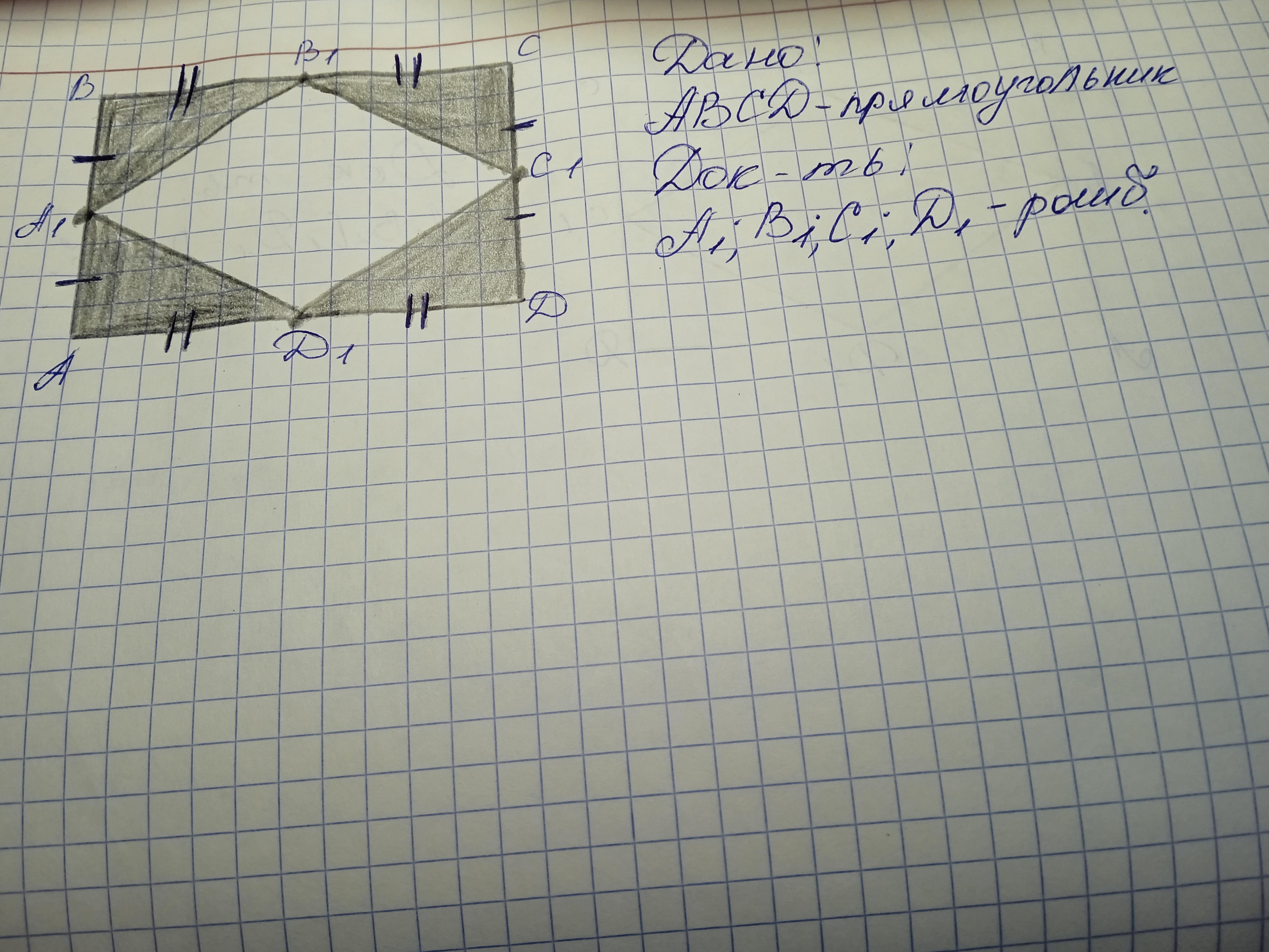 ДОКАЗАТЕЛЬСТВО: треугольники А₁ВВ₁, В₁СС₁, С₁ДД₁ и АА₁Д₁ – прямоугольные и равны по первому признаку – двум катетам (по условию, согласно равенства сторон), поэтому А₁В₁=В₁С₁=С₁Д₁=А₁Д₁, следовательно четырёхугольник А₁В₁С₁Д₁ – равносторонний. Проведём его диагонали А₁С₁ и В₁Д₁. Так как точки А₁, В₁, С₁, Д₁ взяты с середин сторон прямоугольника АВСД, то: