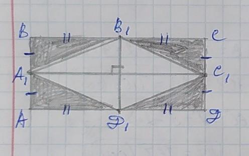 В₁Д₁ || АВ || СД, аналогично: В₁Д₁=АВ=СД, а также диагонали также точкой пересечения делятся пополам, и так как стороны прямоугольника перпендикулярны и имеют разную величину, то и диагонали четырёхугольника так же будут перпендикулярны и разные по длине. Четырёхугольник А₁В₁С₁Д₁ имеет свойства ромба: все его стороны равны, диагонали имеют разную величину, пересекаются под прямым углом и точкой пересечения делятся пополам, следовательно