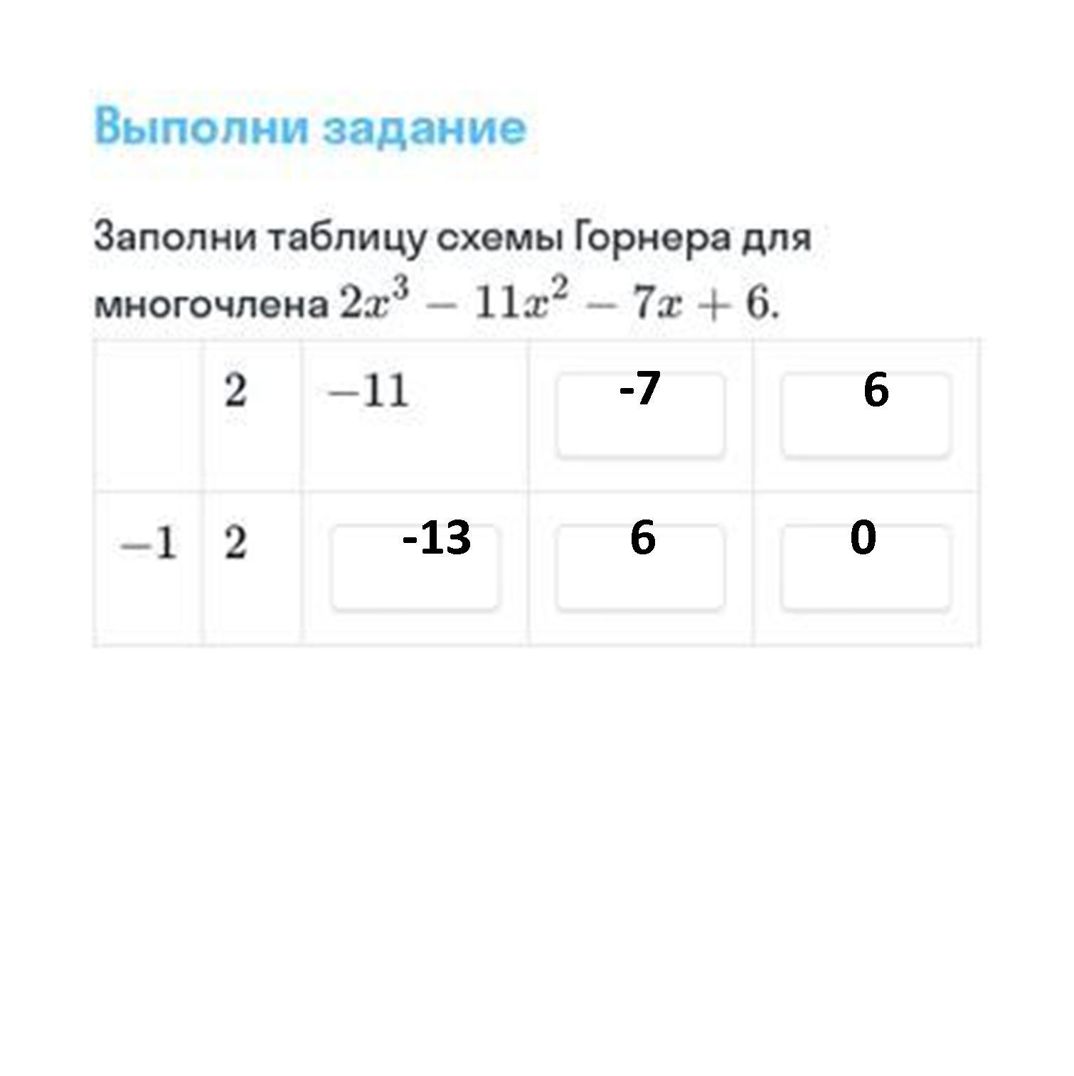 1) По схеме Горнера в первой строке - коэффициенты данного многочлена.
