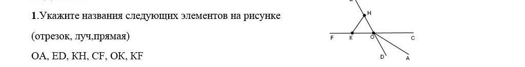 1. укажите названия следующих элементов на рисунке (отрезок, луч. прямая) oa, ed, kh, cf, ok, kf