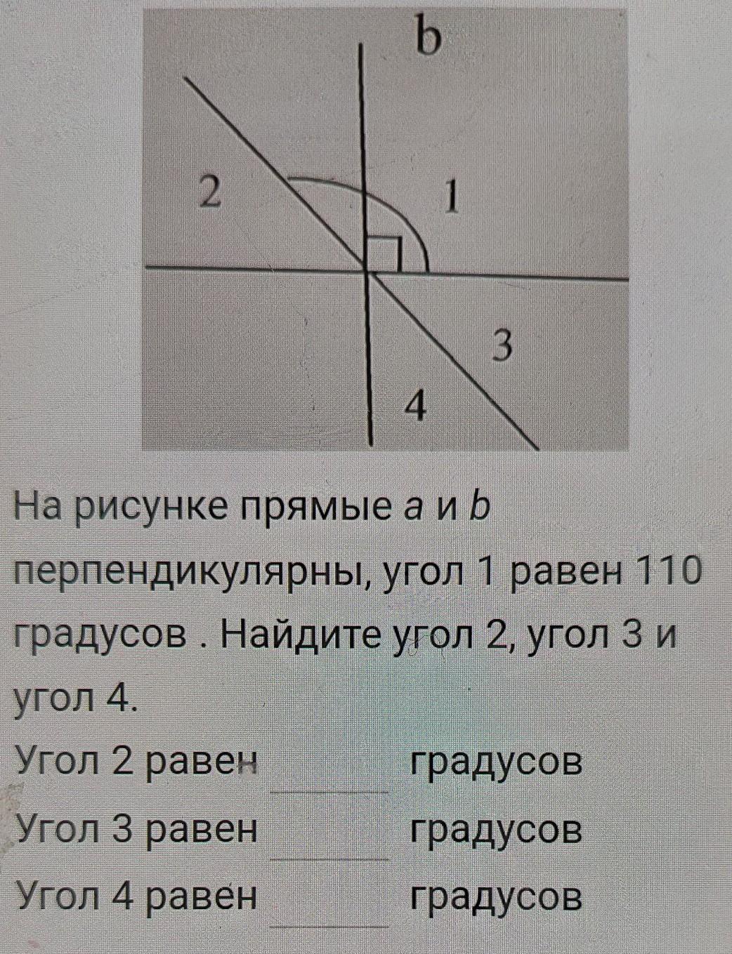 на рисунке Прямые A и B перпендикулярны, угол 1 равен 110 градусов .Найдите угол 2, угол 3 и угол 4