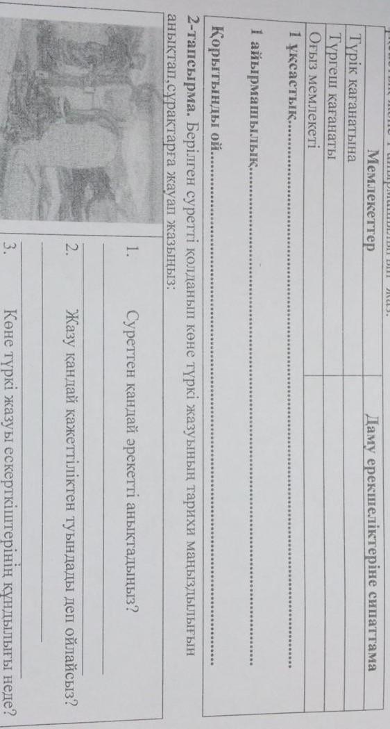 БЖБ 1. 6-сынып «VI - IX ғасырлардағы Қазақстан» бөлiмi бойынша жиынтык бағалау 1-тапсырма. VI-IX гасырлардағы мемлекеттердiн даму ерекшеліктерін сипаттап жазып, уксастык және 1 айырмашылығын жаз. Мемлекеттер Турiк каганатына Түргеш каганаты Оғыз мемлекеті 1 уксастык... 1 айырмашылык... Корытынды ой....... 2-тапсырма. Берілген суретті колданып кене түркi жазуынын тарихи маныздылыгын аныктап,сурактарға жауап жазыныз: 1. Суреттен кандай әрекетті аныктадыныз? Жазу кандай кажеттiлiктен туындады деп ойлайсыз? Көне түркі жазуы ескерткіштерiнiн кұндылығы неде? Даму ерекшеліктеріне сипаттама 2. 3. Корытынды ой