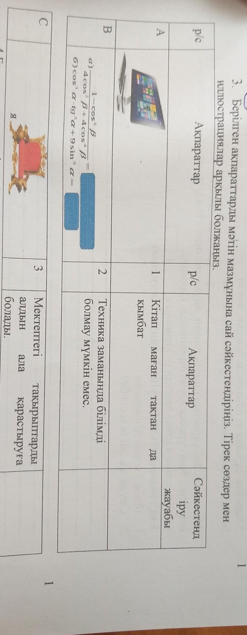 3. Берілген ақпараттарды мәтін мазмұнына сай сәйкестендіріңіз. Тірек сөздер мен
