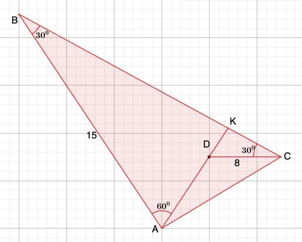 Внутри треугольника ABC выбрана точка D так, что ∠BAD=60∘ и ∠ABC=∠BCD=30∘. Известно, что AB=15 и CD=8. Найдите длину отрезка AD. Если необходимо, округлите ответ до 0.01 или запишите его в виде обыкновенной дроби.
