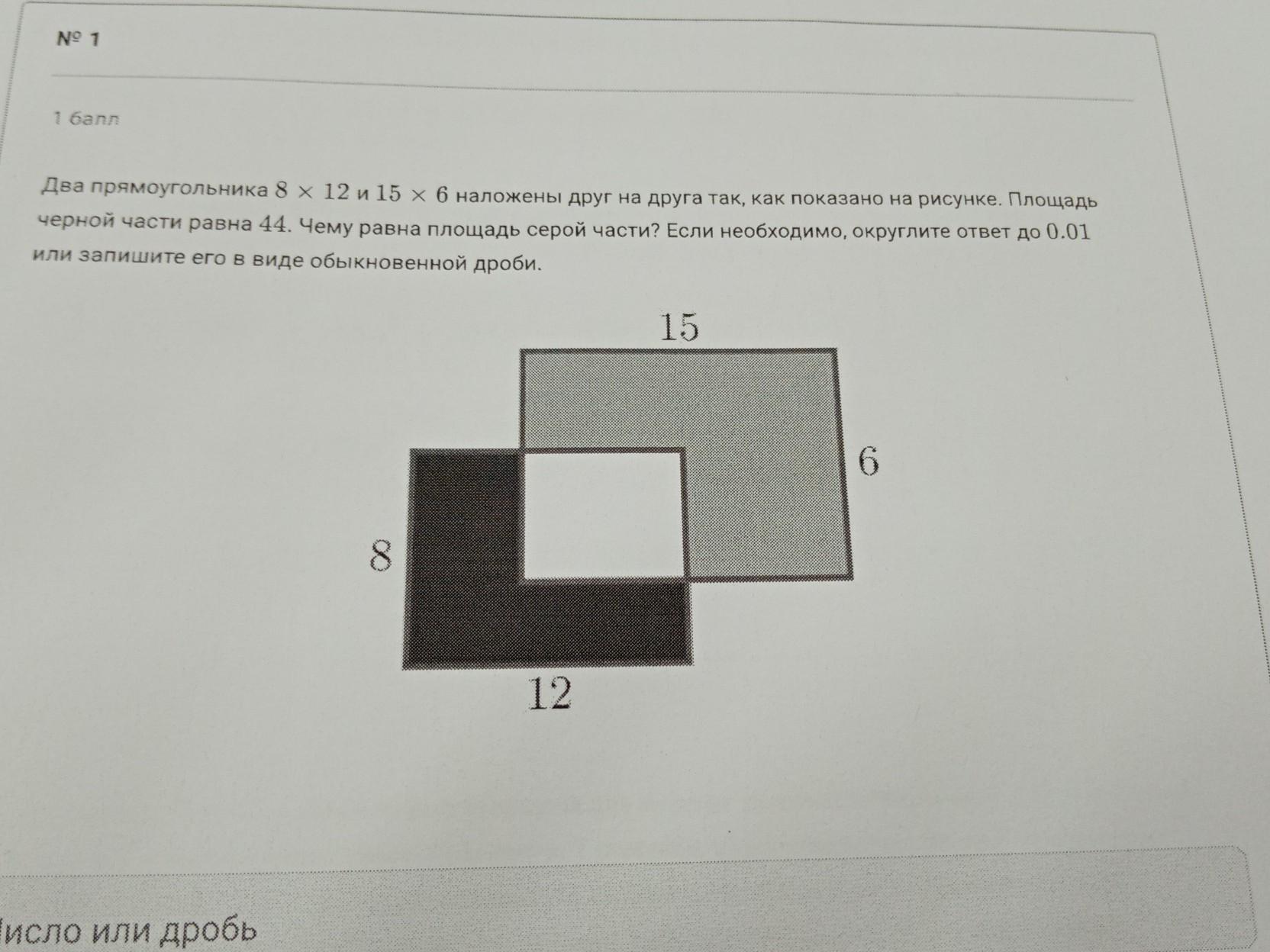 Ne 1 1 балл Два прямоугольника 8 х 12 и 15 x 6 наложены друг на друга так, как показано на рисунке. Площадь черной части равна 44. Чему равна площадь серой части? Если необходимо, округлите ответ до 0.01 или запишите его в виде обыкновенной дроби. 15 6 8 12. Число или дробь
