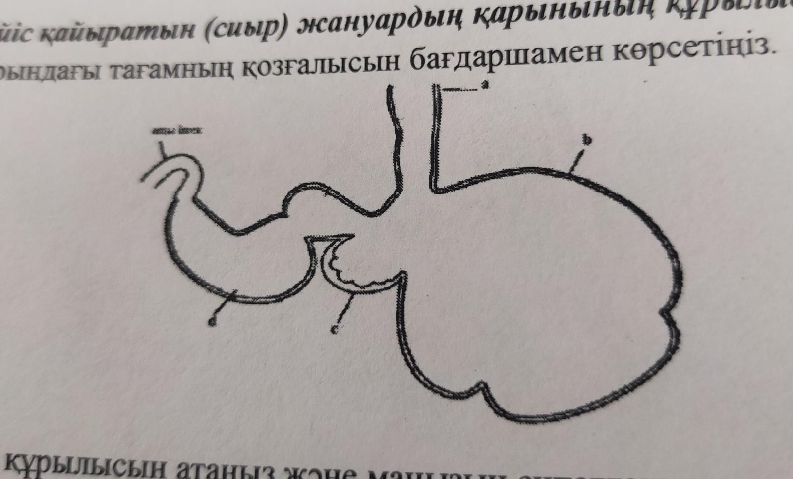 10. Күйіс қайыратын (сиыр) жануардың қарынының құрылысы суретте берілген. (а) Қарындағы тағамның қозғалысын бағдаршамен көрсетіңіз. [1] |