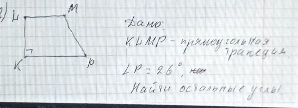 Угол К = углу Л = 90° , так как они прямые , т.к сума углом трапеции 360 то : 360-(90+90+26)= 154(угол М)