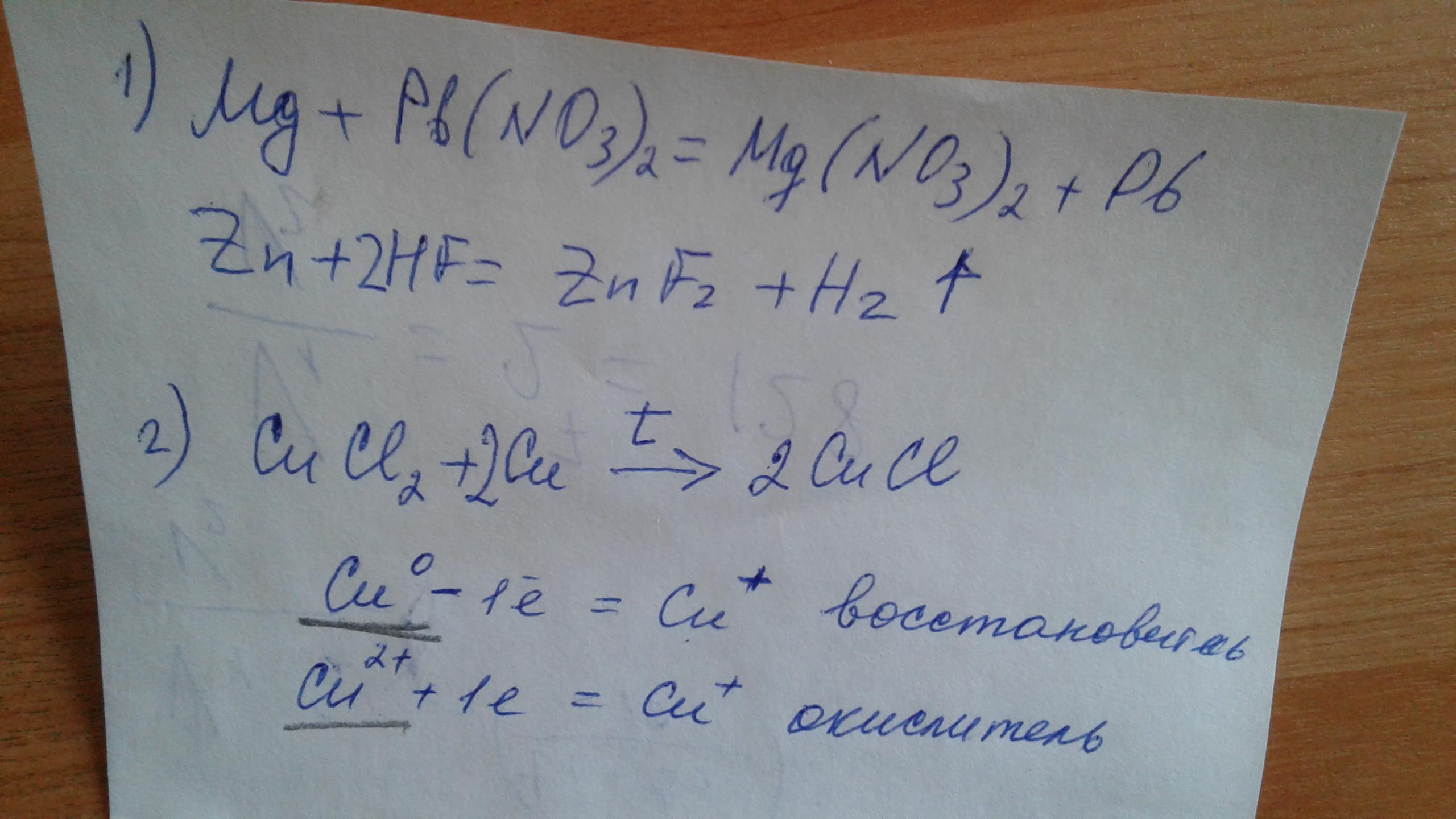 1)Между какими веществами, взятыми попарно, возможны реакции: серебро и плавиковая кислота, магний и нитрат свинца, цинк и плавиковая кислота? Напишите уравнения реакций.
