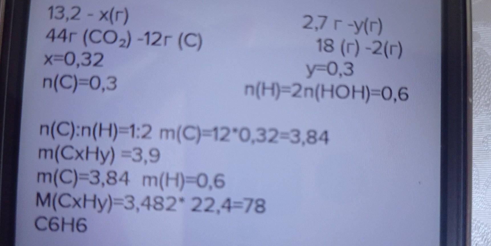 При полном сгорании 3,9г углерода образовалось 13,2г углекислого газа и 2,7 г воды. Плотность паров вещества 3,482г/л. Выведите молекулярную формулу.