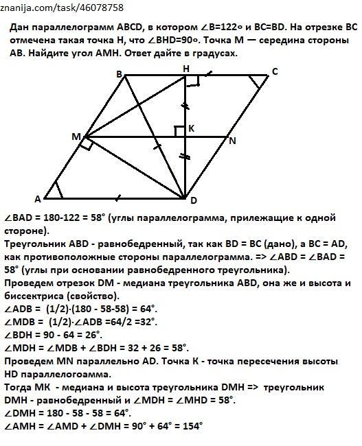 Дан параллелограмм ABCD, в котором ∠B=122∘ и BC=BD. На отрезке BC отмечена такая точка H, что ∠BHD=90∘. Точка M — середина стороны AB. Найдите угол AMH. Ответ дайте в градусах.