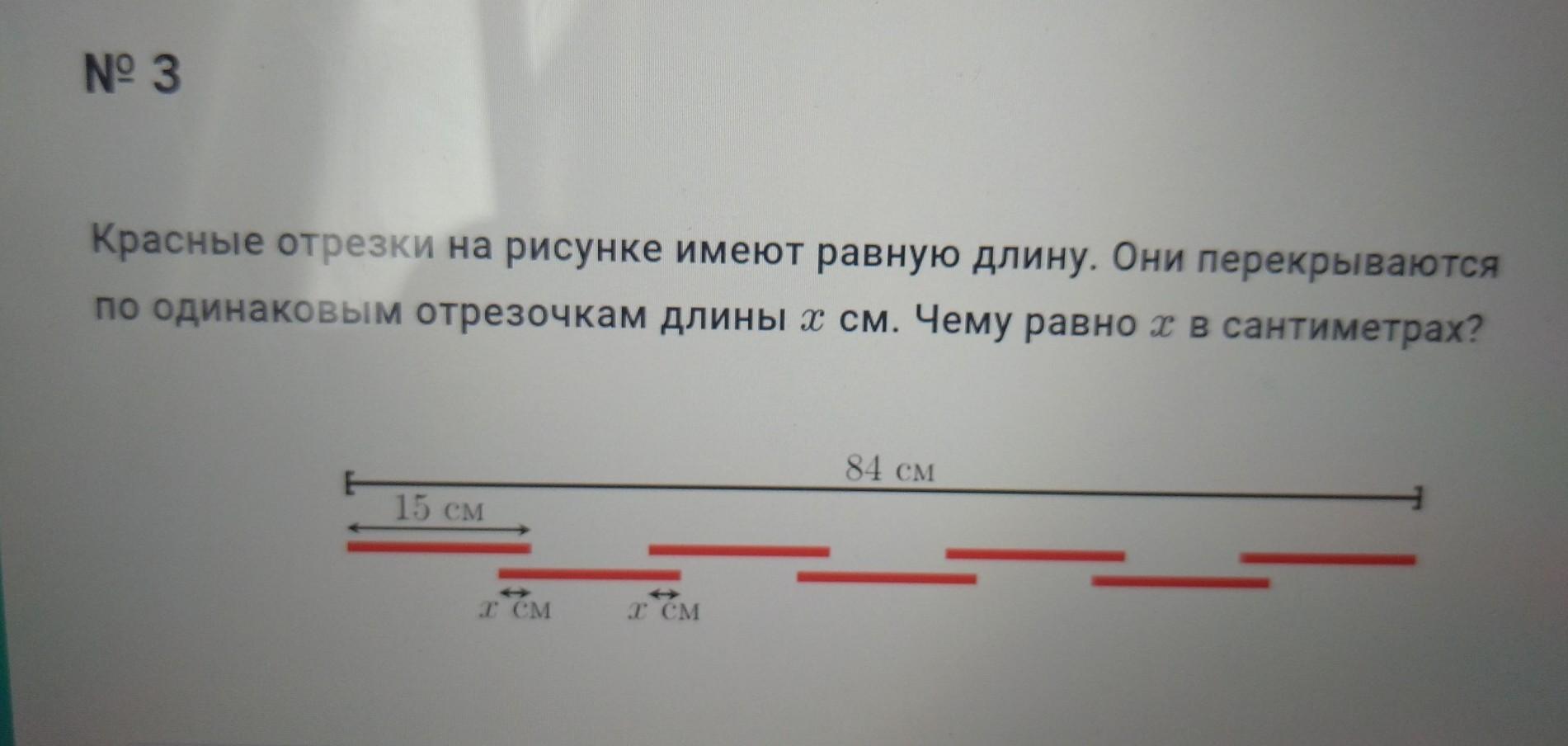 ПОМОГИТЕ ПОЖАЛУЙСТА СРОЧНО) Красные отрезки на рисунке имеют равную длину. Они перекрываются по одинаковым отрезочкам длины I см. Чему равно хв сантиметрах? 84 см 15 см 1 CM x CM