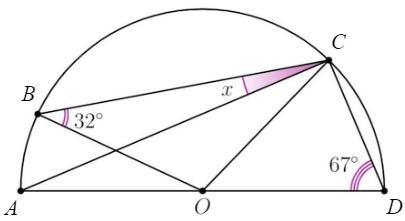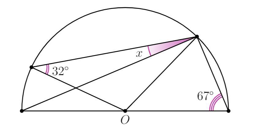 Точка O — центр окружности. Чему равно значение угла x в градусах?
