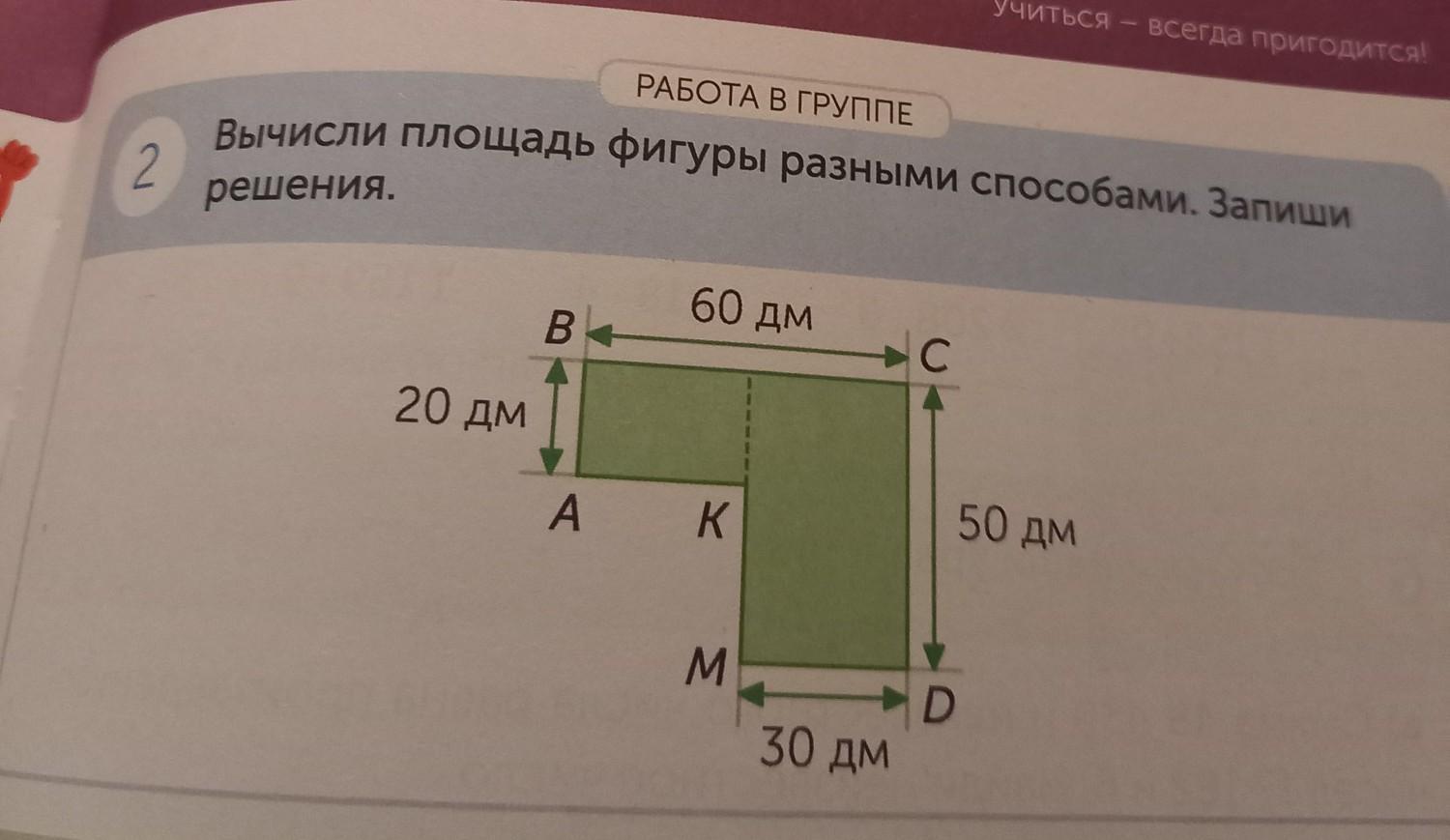 Учиться — всегда пригодится! РАБОТА В ГРУППЕ Вычисли площадь фигуры разными способами. Запиши 2 решения. 60 дм B C 20 дм A K 50 дм M M D 30 дм
