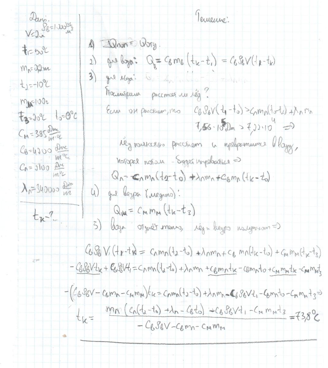 в термостат с 2л воды при температуре 90 опустили кусок льда в медном ведерке .масса льда 0,2 кг, температура-10,масса ведерка 100г его температура считается комнатной(20) .какой будет температура содержимого термостата после установления термодинамического равновесия