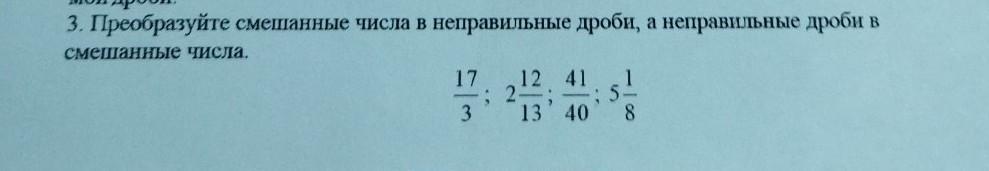 3. Преобразуйте смешанные числа в неправильные дроби, а неправильные дроби в смешанные числа. 17/3 ; 2 12/13 ; 41/40 ; 5 1/8 СРОЧНО!!!