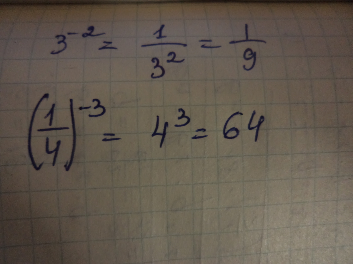 Помогите пожалуйста!!! Как возвести 3 в степень -2! Нужно не просто посчитать (это и на калькуляторе можно), а помогите именно понять, как решать чтобы получить ответ, т.е. Пишите все подробно!!! И если можно еще число 1/4 в степени -3!