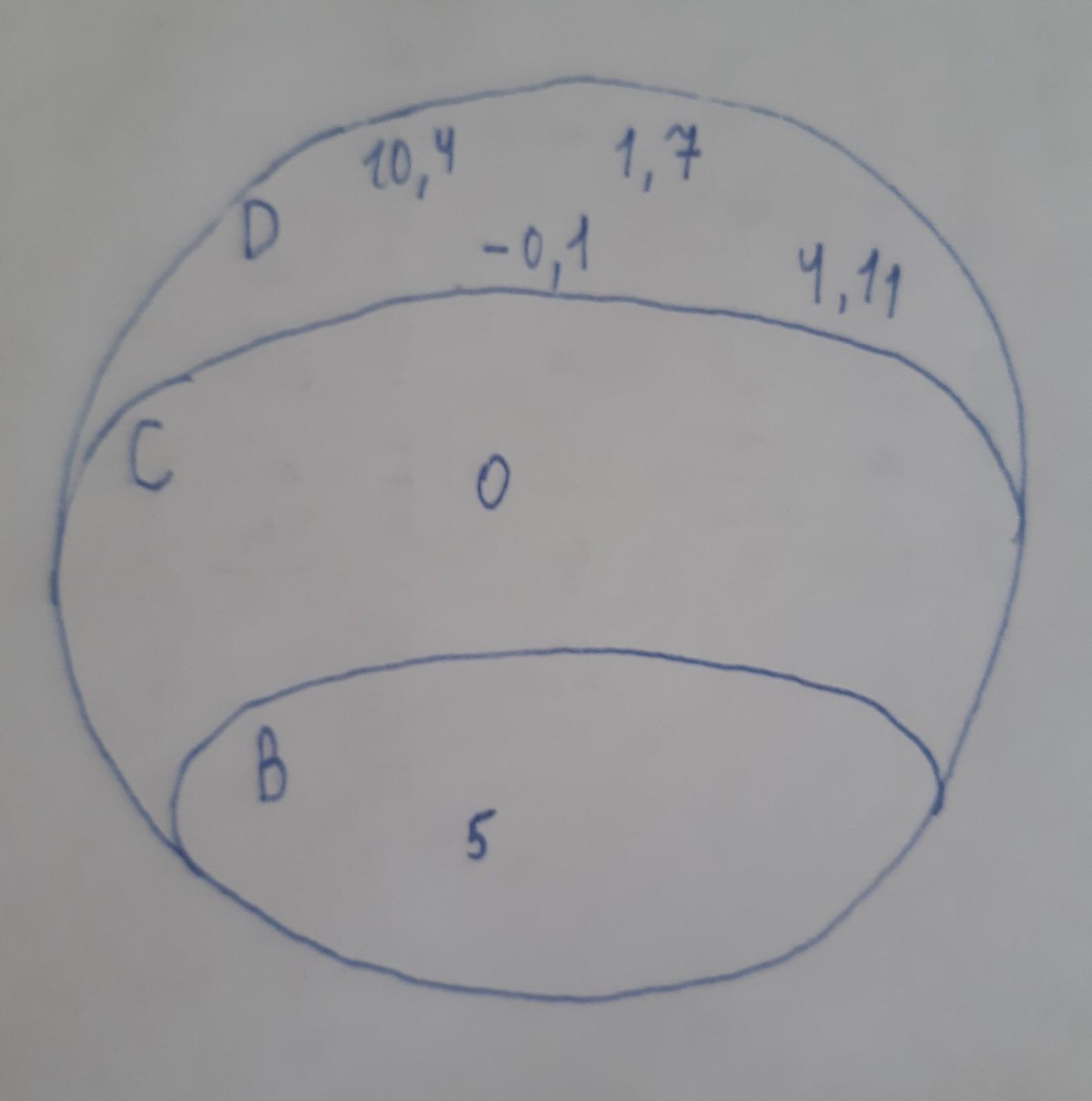ВАРИАНТ 1. Дано множество чисел A A (10,4; 5; 0; 1,7; - 0,1; 4 11). Выделите и множества А годмножества. В - натуральных чисел, с целых чисел и D рациональных чисел. Постройте диаграмму Эйлера Венна для мнолееrn B, C и D и отметьте на ней элементы множества А.