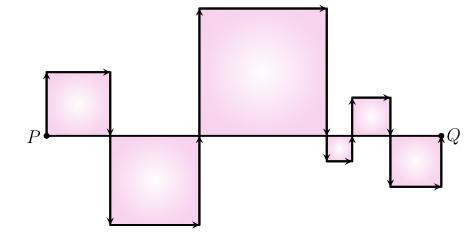 Отрезок PQ поделен на несколько более маленьких отрезков. На каждом из них построен квадрат (см. рисунок).